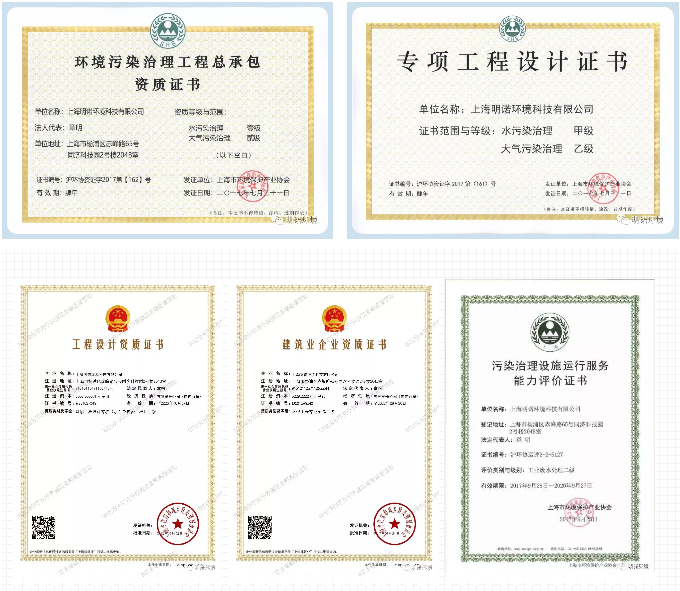 通过不懈努力明诺环境获得了一系列环保领域资质证书,包括环境工程设计专项(水污染防治工程)乙级证书、环保工程专业承包三级证书、环境污染治理工程总承包资质证书、专项工程设计证书水污染治理甲级、大气污染治理乙级证书和污染治理设施运行服务能力评价证书,同时成为上海市环境保护产业协会会员单位。