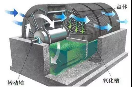 废水从槽的一端流向另一端。盘轴高出水面,盘面约40%浸在水中,约60%暴露在空气中。盘轴转动时,盘面交替与废水和空气接触。盘面为微生物生长形成的膜状物所覆盖,生物膜交替地与废水和空气充分接触,不断地取得污染物和氧气,净化废水。膜和盘面之间因转动而产生切应力,随着膜的厚度的增加而增大,到一定程度,膜从盘面脱落,随水流走。
