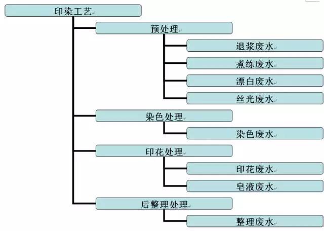印染废水不单单产生于染色过程中,印染过程分多个工序,每一道工序都要排出废水,预处理阶段(包括烧毛、退浆、煮炼、漂白、丝光等工序)要排出退浆废水、煮炼废水、漂白废水和丝光废水,染色工序排出染色废水,印花工序排出印花废水和皂液废水,整理工序则排出整理废水。