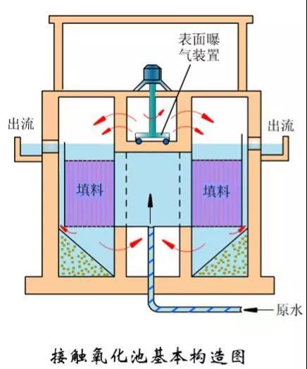 生物接触氧化池停留时间一般为T=8~10小时,COD去除率约55%~60%,色度去除率约50%,气水比一般为(10~12):1。生物接触氧化池通常设计为2~3段。