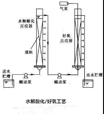 水解酸化-好氧工艺:水解酸化与好氧法结合的厌氧处理已不是传统 的厌氧消化,水力停留时间一般为3~5 h,只发生 水解和酸化作用。这一工艺流程的提出主要是针对 印染废水中可生化性很差的一些高分子物质,期望 他们在厌氧段发生水解、酸化,变成较小的分子, 从而改善废水的可生化性,为好氧处理创造条件, 并能较好地解决PVA、染料的处理问题。