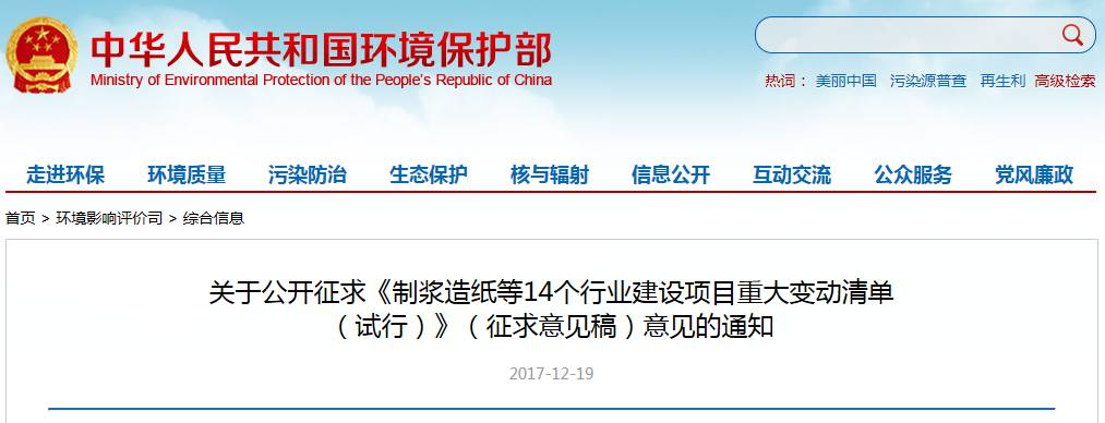 关于公开征求《制浆造纸等14个行业建设项目重大变动清单(试行)》