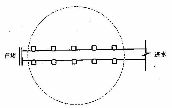 在一根管上均匀布水虽然在理论上是可行的,但在实际中往往是不可实现的,因为这种系统随着时间有些孔口将不可避免发生堵塞。而进水将从没有堵塞的其他孔口重新分配,从而导致在反应器池底的进水分布不均匀,因此应该尽可能避免在一个管上有过多的孔口。目前这种布水方式已较少采用。