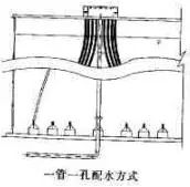 这种配水系统的特点是一根配水管只服务于一个配水点,只要保证每根配水管流量相等,即可取得等流量的配水要求,为了保证每一个进水点达到其应得的进水流量,建议采用高于反应器的水箱式(或渠道式)进水分配系统。这种情况下的一个好处是可以容易用肉眼观察堵塞状况。这类配水方式很容易通过在进水管或渠道与分配箱之间的三角堰来保证等量的进水,在恰当地调整每箱中三角咽水位后获得均匀的流量分配。