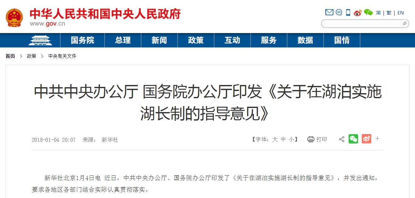 1月4日,在“河长制”推出一年后,中办、国办印发了《关于在湖泊实施湖长制的指导意见》,要求各地在2018年年底前全面建成湖长制。