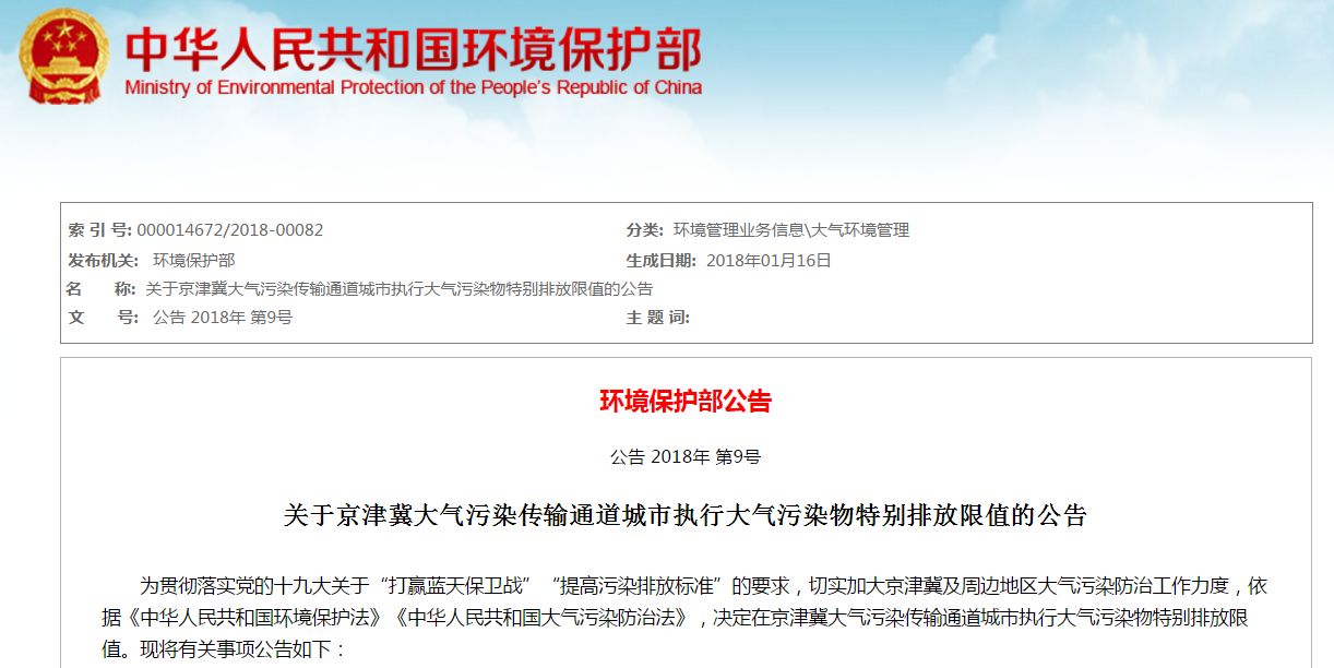 1月16日,环保部印发了《关于京津冀大气污染传输通道城市执行大气污染物特别排放限值的公告》,要求京津冀大气污染传输通道城市(“2+26”城市)将执行大气污染物特别排放限值。