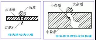 这是过滤截留原理示意图,左图表示超滤由固定孔径机械截留,截留的杂质在表面堆积,小于孔径的杂质会透过膜,液体的过滤路径只有0.1微米。